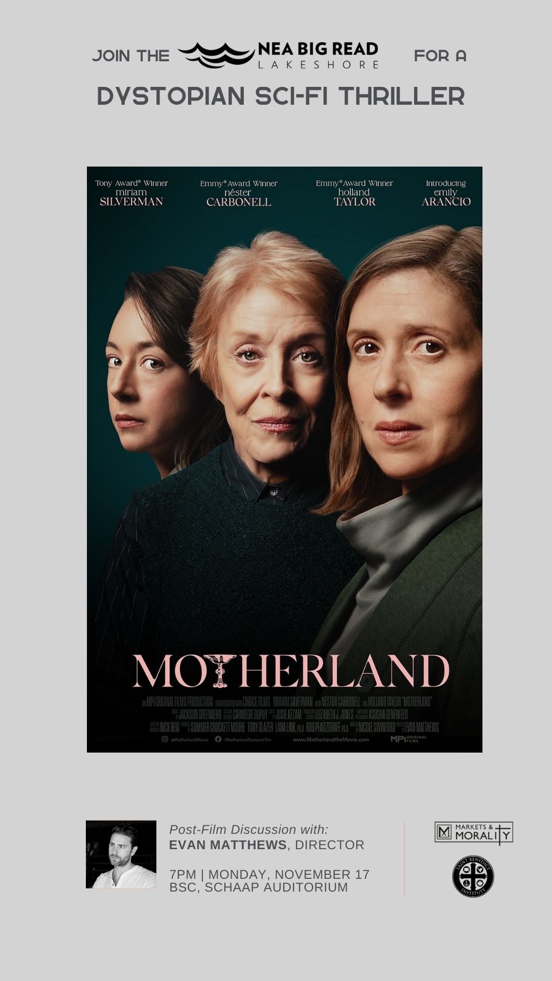 MPI’s forthcoming dystopian film is Motherland. It is directed by Evan Matthews, a veteran of MPI’s programs, and it marks his debut as a narrative feature filmmaker. Evan will be joining us on campus to speak about the movie. The film explores themes such as parental rights, the power of family bonds, the influence of political agendas in schools, the perils of a surveillance state, the risks associated with social credit systems, and the extreme measures governments may take to defend broken institutions.